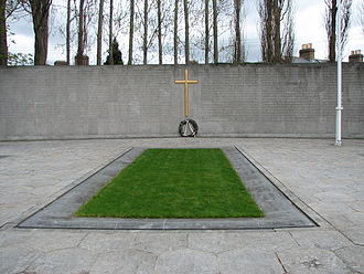 The site of General Sir John Maxwell’s quicklime pit. Old prison yard of Arbour Hill Prison. Burial place of the 1916 Rising leaders. The Proclamation of the Republic of Ireland is inscribed on the wall, in English and Gaelic. From Wikipedia